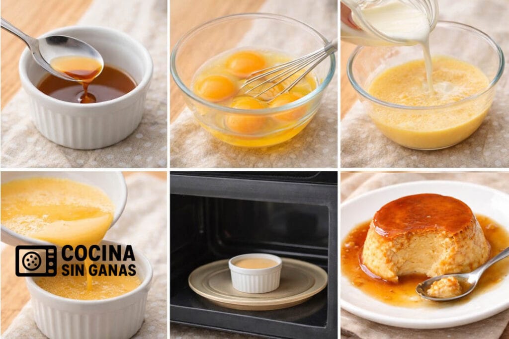 Peligro inexistente: Aquí no hay hornos traicioneros, ni baños maría, ni utensilios que den miedo. Lo más arriesgado es que el microondas haga un “¡PIP!” inesperado y te asuste más de lo que debería. El flan se hace solo; tú solo vigilas que no hierva como un volcán.